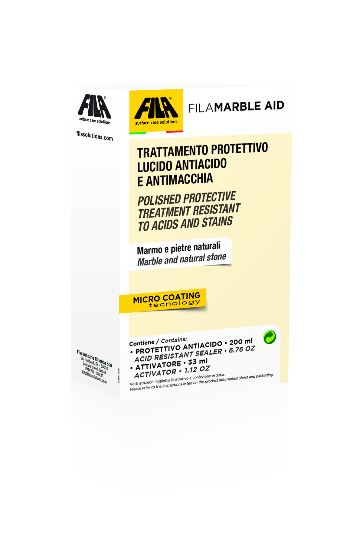 Per preservare la bellezza di marmo e pietre naturali ed evitare di rovinare queste superfici a causa del contatto con sostanze acide e macchianti, FILA ha sviluppato FILAMARBLE AID, il nuovo protettivo antiacido e antimacchia. Idoneo al contatto alimentare, è ideale per superfici delicate come top e piani di lavoro in marmo e pietre naturali che nell’utilizzo quotidiano vengono a contatto con sostanze acide.