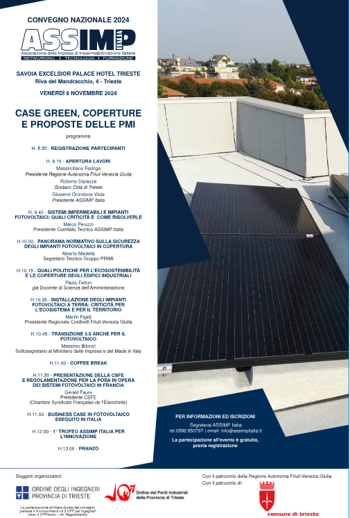 Il Convegno 2024 “Case Green, coperture e proposte delle PMI” si tiene a Trieste grazie al generoso impegno di Stefano Zuban che ha dato un supporto determinante allo staff di ASSIMP Italia nell’organizzazione, ma soprattutto che ha saputo coinvolgere Istituzioni Locali e Nazionali e personalità di spicco del mondo accademico alle quali potremo presentare la nostra attività e le nostre ambiziose strategie in tema ambientale.