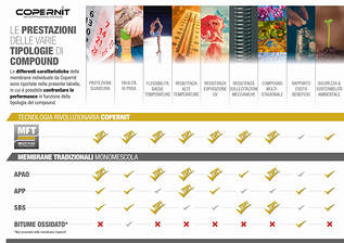 Il nucleo innovativo della tecnologia MFT è il compound dello strato intermedio la cui speciale formula, nata all’interno di Copernit Lab, è proprietà esclusiva di Copernit. La funzione principale di tale compound è quella di legare perfettamente gli strati esterni e l’armatura in un unico prodotto, garantendo l’assoluta e totale compatibilità delle diverse mescole. Questa sinergia non solo migliora l'efficacia delle soluzioni di impermeabilizzazione, ma eleva anche gli standard delle proprietà materiali rispetto alle prestazioni in esercizio creando sistemi più efficienti e resistenti che rappresentano l’approccio ideale per rispondere alle esigenze di un mercato in continua evoluzione.