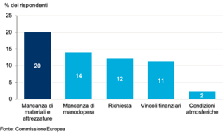 La carenza di materiali e attrezzature è stato il fattore che più ha ostacolato nel 2022 l’attività di costruzione. Secondo la ricerca annuale della Commissione Europea, il 20% delle imprese ha indicato la carenza di materiali e attrezzature come vincolo all’attività edilizia, il livello più alto quando, nel 1985, la Commissione conduce l’indagine. Nel gennaio 2023 l’indice italiano dei responsabili acquisti del settore costruzioni (S&P Global Italy) ha rilevato che, nel dicembre 2022, i tempi medi di consegna dei fornitori hanno continuato ad allungarsi tra diffuse segnalazioni di carenza di materiali.