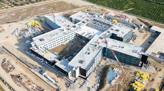 Tra gli aspetti più strategici, l’impermeabilizzazione delle coperture e di alcune aree interne particolarmente sensibili ha richiesto la massimaaffidabilità. In questo ambito, la collaborazione con Polyglass, insieme ai prodotti Mapei, ha giocato un ruolo decisivo, offrendo sistemi certificati capaci di unire protezione e sostenibilità. L’ospedale si distingue anche per l’ampio ricorso alla prefabbricazione, non solo nelle strutture portanti, ma anche negli impianti e nelle finiture architettoniche. Questa scelta ha consentito di ridurre tempi e costi di realizzazione, migliorando al contempo la qualità esecutiva.