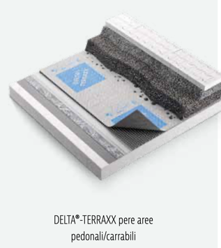 Lo speciale geotessuto consente la filtrazione e il corretto drenaggio dell’ac- qua attraverso un’intercapedine di soli 9mm. In funzione della tipologia di carichi applicati è possibile scegliere tra le versioni Delta-Terraxx Light e Delta-Terraxx (dedicate principalmente ad aree verdi) o Delta-Terraxx Ultra ad altissima resistenza alla compressione (fino a 750 kN/m2) in caso di aree pavimentate pedonali o soggette a traffico veicolare pesante. Le membrane Delta-Terraxx sono conformi ai requisiti previsti delle Norme EN 13252 UNI 11235, EN 4095 e hanno una garanziadi durabilità di 100 anni in suolo naturale.