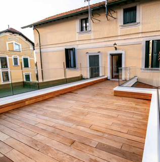 Per terminare l’opera di ristrutturazione, sulla parte superiore del muretto perimetrale e a chiusura del rivestimento in legno è stata posizionata una scossalina metallica preverniciata sopra la quale è stato fissato un profilo in alluminio verniciato di supporto alle pannellature di vetro, avendo così un parapetto perimetrale di circa 105 cm.