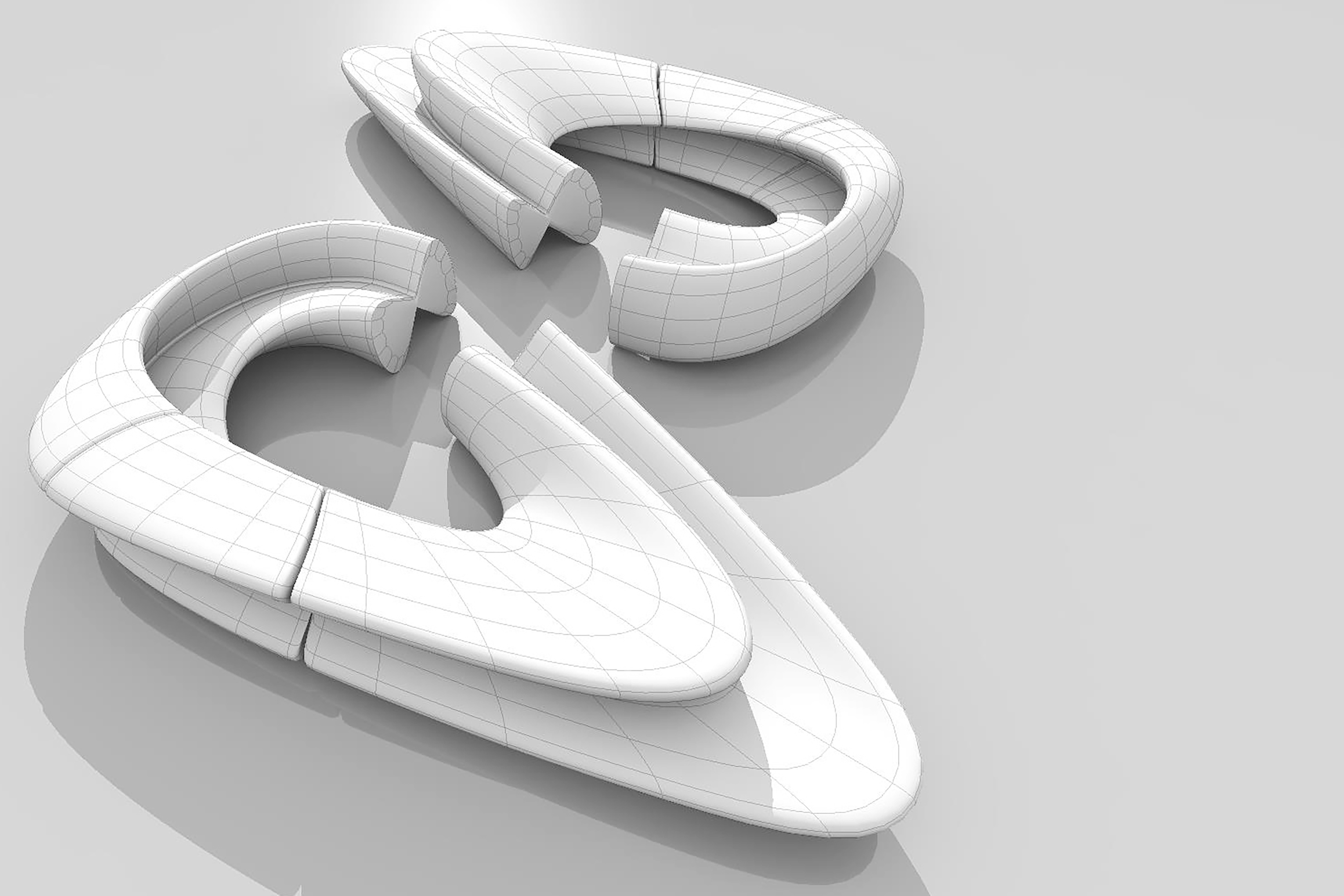 Sistema di seduta modulare volta a ridurre al minimo gli sprechi di materiale. Per ottimizzare il materiale verranno eseguiti quattro tagli dai quali si ricavano due sedute e un elemento di congiunzione in ordine di grandezza, facendo si che la seduta più grande dipenda da quella più piccola e viceversa. Il taglio a 5,7° è coincidente e rende agevole l’atto di alzarsi dalla seduta grazie alla sua concavità. Il collegamento di queste forme permette di realizzare infinite combinazioni, composizioni ad isola, ad angolo aperto o chiuso, a parete oppure strutture in linea adatte ad ogni contesto d’uso. Dagli scarti derivano la rastrelliera e le chiusure della seduta.