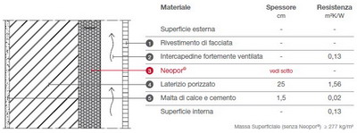 - Caratteristiche tecnico prestazionali: L’isolamento per facciata ventilata con lastre in Neopor® conferisce alla chiusura verticale un eccellente potere isolante, attenua i ponti termici in corrispondenza degli elementi in c.a. e mantiene inalterate le prestazioni termiche dell’involucro essendo costituito da lastre isolanti indeteriorabili e permanentemente asciutte.