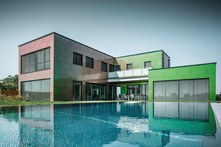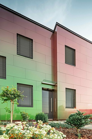 Una concezione della facciata dalla superficie cangiante che trasmette all’ambiente circostante impressioni di colore costantemente diverse. Una casa come un camaleonte.