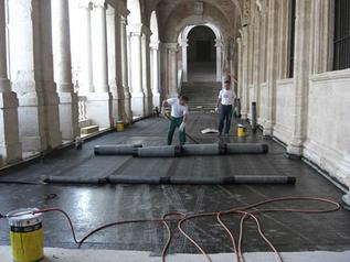 Derbigum GC (genio civile) è un manto impermeabile totalmente affidabile destinato a progetti di costruzioni che richiedono prestazioni eccezionali. Questa membrana è stata selezionata perché rispondente a tre diverse necessità di questo particolare cantiere; è dotata di un’elevata resistenza meccanica che la rende ideale per il supporto della pavimentazione realizzata con un materiale particolarmente pesante (blocchi a “masegno” in pietra di trachite) nonché per le successive trasformazioni del pavimento galleggiante della terrazza sommitale; è caratterizzata da coefficienti di dilatazione elevati che le permettono di adeguarsi ai continui assestamenti dell’edificio storico; ha consentito l’accatastamento e lo spostamento dei pesanti elementi della pavimentazione storica durante le successive fasi del cantiere.