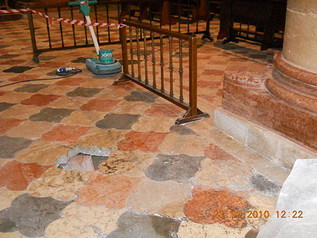 La pavimentazione, non supportata da un solaio, nella zona interessata dai vuoti di più ampia dimensione presentava un leggero avvallamento e una serie discontinua di lesioni in corrispondenza della linea di maggiore cedimento.