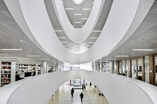 “La natura delle biblioteche cambierà considerevolmente nei prossimi 50 anni, quindi servono soluzioni edilizie particolarmente flessibili” afferma l’architetto. La superficie di Rockfon Mono Acoustic si lascia curvare, permettendo ai progettisti di dare allo spazio un’impronta molto personale.