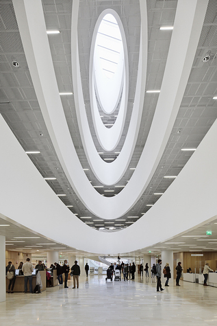 Il cuore della Kaisa House è un magnifico atrio ovale che si innalza in tutto l'edificio. Le curve dell'atrio si armonizzano con le aperture ricavate nel prospetto occidentale dell'edificio. I balconi bianchi su ogni piano sembrano sospesi nell'aria come anelli concentrici e attirano lo sguardo verso l'alto.