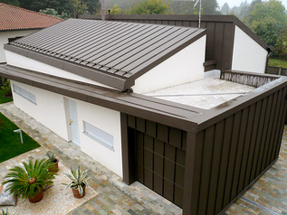 Si tratta di un prodotto particolarmente versatile, concepito proprio per favorire la personalizzazione a seconda delle esigenze sia con rivestimenti applicati – come nel caso del rivestimento in lamiera d’alluminio verniciata a caldo, fissata in doppia aggraffatura – sia con diverse tipologie di vetrature. Il garage indipendente dall'abitazione, utilizzato come box per l'auto di uso quotidiano, dispone invece di un portone basculante Hörmann Berry N80 (larghezza 2.680 mm; altezza 2.195 mm), rifinito con il motivo 905 e dotato di motorizzazione SupraMatic E.