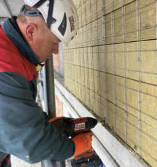 Una volta posizionati i pannelli, ancorati ai cordoli, si passa alla loro unione reciproca mediante appositi anelli in acciaio zincato, successivamente, si procede al taglio della maglia metallica in corrispondenza delle forometrie. L’installazione del cappotto armato si completa con una leggera tassellatura mediante idonei tasselli da cappotto, conformi al suo spessore, nel numero di 2 al mq, e dei punti di adesivo poliuretanico per garantire la perfetta aderenza fra supporto e cappotto.