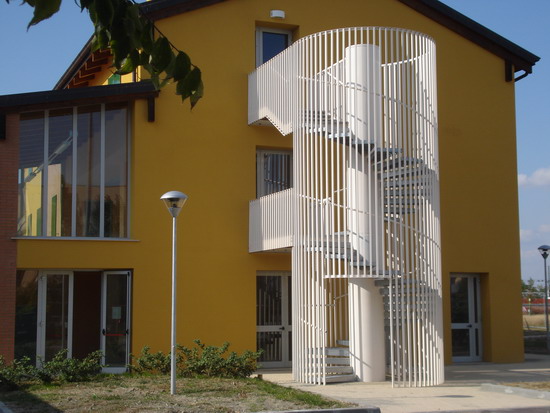Il progetto della scala a chiocciola della Casa del volontariato in Fidenza è stato pensato con una struttura portante ad unica colonna centrale Ø812x9,5. Il piano di calpestio è stato realizzato in grigliato m. 15x76 p.p. 25x2, mentre i tamponamento perimetrale in tubi di sezione quadra.