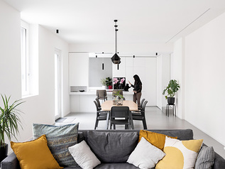 Luca ed Alessandra, i due giovani proprietari, hanno deciso di acquistare due delle quattro unità disponibili per creare un unico spazio abitabile pari a circa 150 mq e ricavarne una casa semi-indipendente. Per l’esecuzione si sono affidati all’architetto Giulio Renzi di Deonstudio che li ha seguiti durante l’intero percorso, durato tra fase di progetto e realizzazione circa due anni. La mancanza di elementi all’interno che valesse la pena preservare ha agevolato la presa di decisione comune di creare una netta contrapposizione preservando intatta la facciata esterna, creando ambienti più consoni ad un abitare e ad uno stile di vita dinamico e moderno. “Era chiaro che la contrapposizione tra esterno ed interno dovesse essere netta, radicale e onesta testimonianza di un cambiamento di epoca. Abbiamo pertanto rimarcato le identità degli opposti, cercando di lavorare all'interno su una configurazione degli ambienti purista” ha detto l’architetto Giulio Renzi.