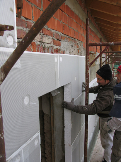 La coibentazione esterna inizialmente era stata fissata su tre lati dell’edificio (i lati nord, est e ovest). Il cascinale si presenta con due lati lunghi di circa 35 m ed è orientato, nel senso longitudinale, in direzione est-ovest. Uno dei due fronti lunghi è posizionato completamente a nord e l’altro completamente a sud e i due fronti più corti rispettivamente a est e a ovest. La committenza, compresa la validità del sistema e i benefici che questo tipo di coibentazione è in grado di garantire nel tempo, ha così deciso di realizzare il cappotto termico anche in un’ampia parte della facciata posizionata a sud.