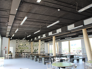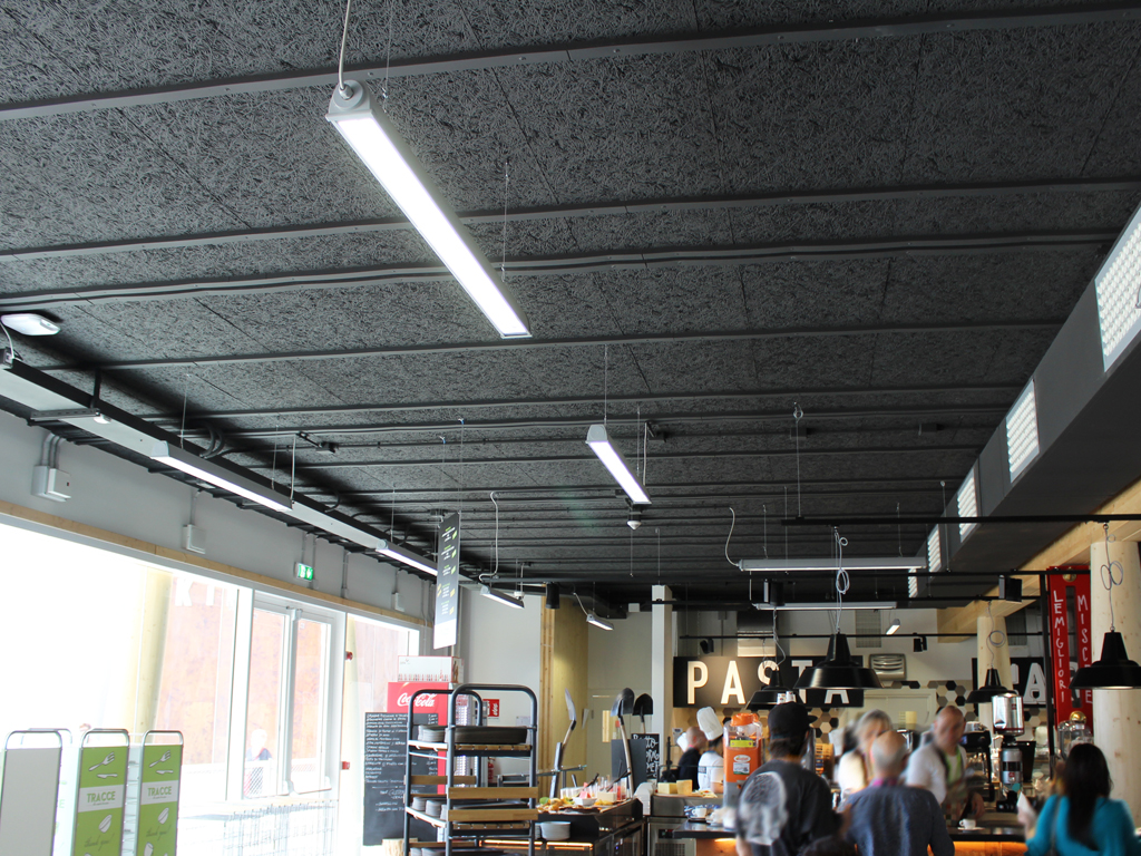 I pannelli Celenit sono uno degli elementi più riconoscibili del design dei centri servizi, che devono ai principi di funzionalità ed essenzialità la progettazione degli interni. I pannelli assolvono la funzione di barriera al rumore, visto l'affollamento degli spazi, ma assumono anche la valenza di elemento decorativo del soffitto.