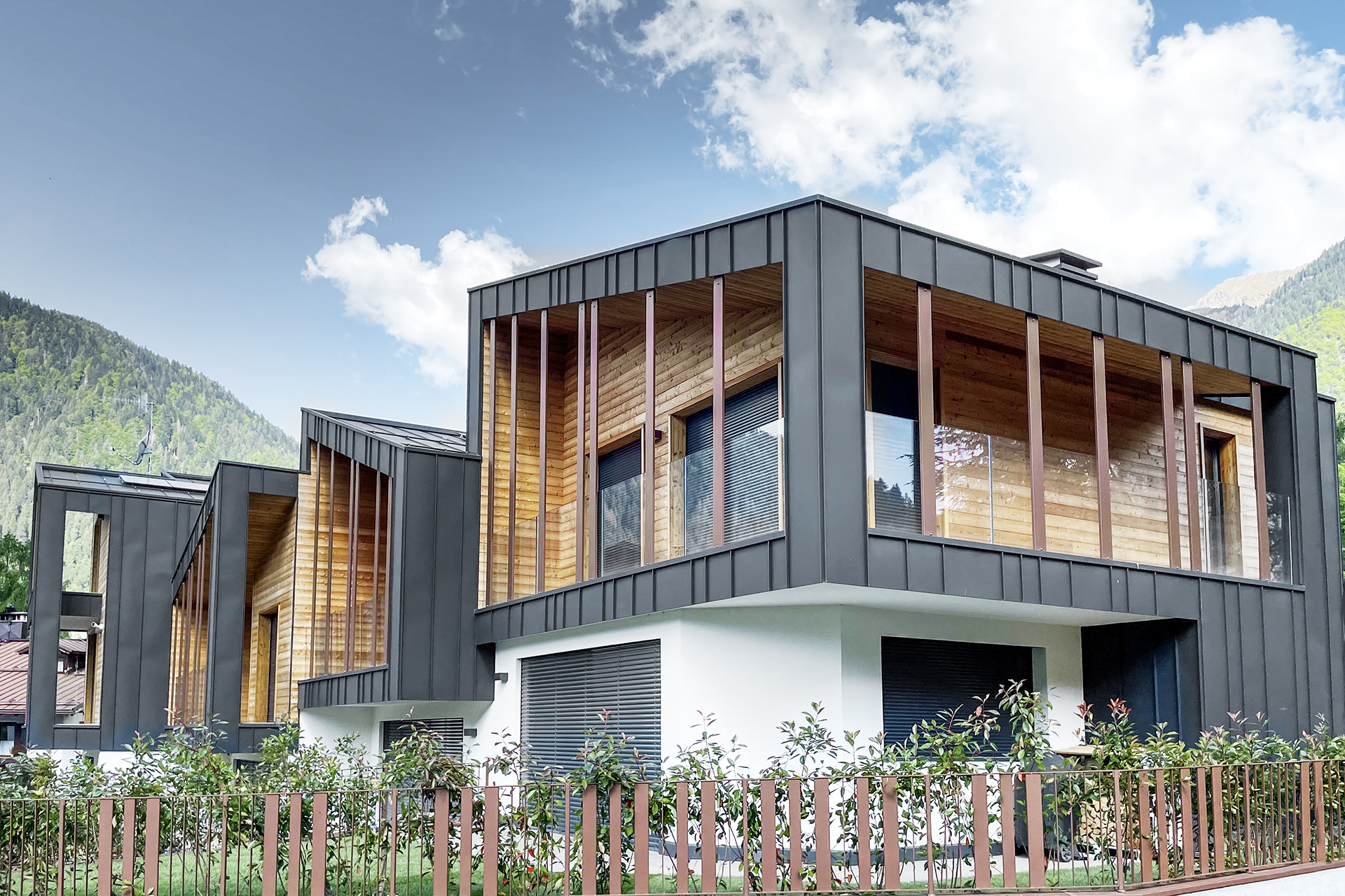 Fatta eccezione per gli interrati dove è stata realizzata una struttura in cement armato, la struttura portante degli Chalet è stata creata con pannelli X-lam. Per quanto riguarda i rivestimenti gli architetti hanno giocato con materiali dalle texture, colori, anime differenti, accomunate dalla tensione verso la massima naturalità e integrazione con l’intorno. Troviamo quindi il calore delle doghe in larice per le pareti superiori e il rivestimento sottogronda degli sporti, la trasparenza dei parapetti in vetro extrachiaro che slanciano i balconi massimizzando l’apporto solare verso gli ambienti e poi la leggerezza dell’alluminio PREFA, scelto in forma di nastro sia per le facciate che per la copertura, nel colore antracite per richiamare immediatamente la forma, i colori e la solidità delle rocce delle montagne.