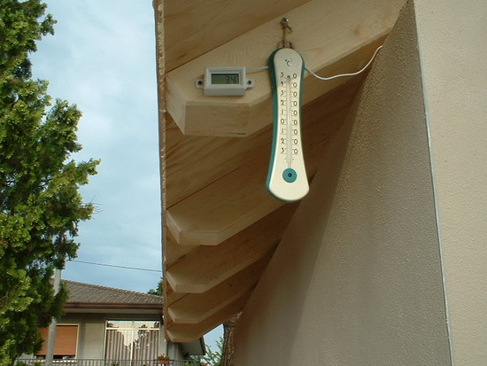 La costruzione è stata quindi realizzata con una muratura Porotherm Bio-Plan, laterizi a elevata biocompatibilità in quanto prodotti unicamente con impasti di argille naturali e farina di legno, dello spessore di 45cm completata con 2,5 cm di termo intonaco Kerakoll Bioacalce all’esterno per uno spessore totale di 48 cm. La muratura poggiava su di una soletta di base dello spessore di 12cm realizzata fuori opera e poi posata direttamente a terra su un semplice spiano di sabbia. La copertura a due falde è stata realizzata con una struttura in legno e copertura in tegole Wierer, isolata attraverso un pacchetto di isolante Celenit per uno spessore totale di circa 30 cm. La soluzione dell’involucro è stata studiata per assolvere ai requisiti già richiesti dalla legge nazionale (DLgs 311/2006) per il 2010.