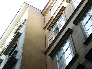 La presenza di lesioni, sulla facciata prospiciente Via Hörlgasse, ma non su altre zone, denotava una diversa sensibilità al cedimento da parte delle varie porzioni dell’edificio. Il piano seminterrato dello stabile, infatti, era presente solo su metà circa dell’intera superficie in pianta, di conseguenza il piano d’imposta delle fondazioni non era uniforme.