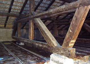 Come si nota nella fotografia in alto a sinistra i Tralicci LPR® sono posizionati al di sopra di ogni travetto e avvitati saldamente ad essi, seguendo uno schema statico di progetto. Mentre nella foto in alto a destra si nota un particolare del rinforzo strutturale con Traliccio LPR® avvitato tramite prefori sulle travi tonde esistenti. E’ buona norma provvedere alla stesura del telo Peter Cox sul tavolato, per evitare che l’acqua del getto penetri al piano inferiore. Questo genere di tessuto è traspirante al vapore, pertanto evita la condensa sotto la soletta.