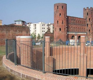 Una via lastricata a “opus incertum” con lose di pietra e ciuffi d’erba, segnata da cordoli in cotto a pasta molle, accompagna il visitatore sotto la porta romana. A fianco un grande prato verde si estende fino a via XX settembre raccolto da una cancellata in ferro battuto e colonne, composte da laterizio “faccia a vista” prodotto manualmente in stampi storici originali.