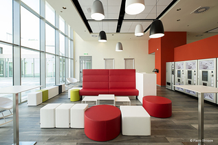 Il design accattivante delle lame metalliche verticali di Baffles Metal V-P 500, integrate da un’opportuna illuminazione, distingue con un tocco di originalità, il percorso di forte passaggio tra l’area della reception ed i laboratori limitando, al contempo, con grande efficacia, la propagazione del rumore nelle zone circostanti. Infine, un forte imprinting stilistico è conferito anche all’auditorium di Eldor, grazie all’ampia versatilità degli elementi Optima L Canopy che, con giochi di forme, colori ed altezze, ha permesso la creazione di uno spazio piacevole e di grande fruibilità, che valorizza, ancora una volta, la persona ed il suo benessere.