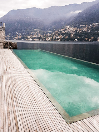La piscina con vista sul lago è in pietra carsica del Brasile con il deck in frassino e poggia su piedistalli autolivellanti e regolabili della gamma Pedestal Line di Impertek.