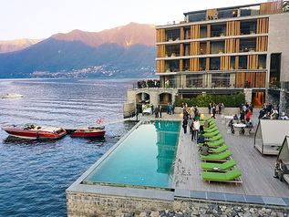 Sedie e lettini in corda intrecciata, divani in tessuti filati e pelle, la pietra e l’acciaio che si sposano con il legno e le vetrate da cui si intravedono i riflessi verde-azzurri del lago caratterizzano l'elegante struttura.