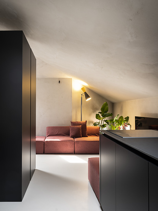 In questo ambiente privo di divisioni, il progettista ha potuto immaginare scene di vita: ne è nato un nuovo spazio concepito come una scatola neutra, un contenitore al cui interno inserire i mobili. Sono solo gli arredi a fungere da separatore degli spazi.