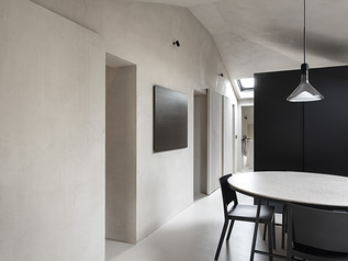 La scelta di materiali naturali ha guidato l’intero progetto. Pavimenti, pareti e soffitti appaiono in un’unica tinta: a terra è stato posato un cemento resina grigio caldo molto chiaro abbinato alla finitura della parete in intonaco a base roccia di Gambassi.