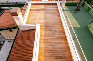 Per ottenere una superficie di calpestio piana, la soluzione ottimale è stata l’installazione di supporti BalancePro con il sistema di teste Cross di Impertek; il sistema è realizzato per consentire un aggancio veloce del magatello Mini Rail. Per la realizzazione di questa terrazza sono stati utilizzati 300 supporti BalancePro e 80 metri lineari di magatello Mini Rail. Gli stessi magatelli sono stati utilizzati anche per la realizzazione delle pareti verticali della terrazza e come finitura è stato scelto un legno Tek naturale.