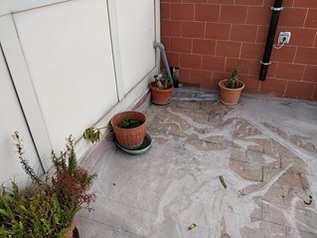 La terrazza dell’edificio di San Giorgio a Cremano, soggetto a problemi di infiltrazione, era stato in origine rivestito con piastrelle in cotto. Lo smantellamento delle stesse, per il ripristino dell’impermeabilizzazione, avrebbe richiesto un intervento oneroso e troppo lungo a livello di tempo.