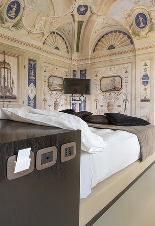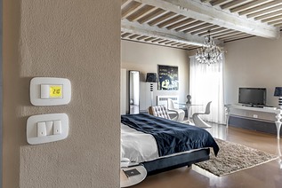 Costruito agli inizi del ‘400, il Palazzo fino al XIX secolo fu di proprietà dell’omonima famiglia notabile, per poi essere ceduto ad una famiglia di farmacisti e alchimisti pontifici. In questi storici spazi affrescati sono così state ricavate 12 camere - di cui 5 Superior, 3 Deluxe, 3 junior Suite e 1 Suite – un ristorante, un centro benessere e una galleria d’arte. L’impianto elettrico è stato recentemente rinnovato e integrato con il sistema domotico By-me di Vimar. Per le strutture con una capienza limitata - come Palazzo Bontadosi - questa rappresenta infatti la soluzione ideale perché consente di automatizzare le camere offrendo la possibilità di supervisionarle direttamente dalla reception. Luci, clima e automazioni di ogni stanza possono così essere gestiti localmente dall’ospite o regolati centralmente tramite il tablet presente nella reception. Questo grazie al web server Vimar e l’intuitiva app By-web, che consente ai titolari e al personale di avere sempre sotto controllo l’intera struttura. La tecnologia Vimar è stata scelta anche per l’esigenza di non intervenire con opere murarie e questo è stato possibile installando in ogni camera un modulo domotico multifunzione Vimar, un dispositivo da quadro che ha permesso di realizzare un impianto domotico senza dover eseguire interventi invasivi, ma semplicemente collegando il cavo Bus ai suoi ingressi e uscite. Per fare da cornice ai comandi Vimar è stata scelta la serie Arké in due diverse varianti, entrambe nella versione Round in metallo, ma differenti nella tonalità - polar matt total look e bronzo matt - in modo da integrarsi perfettamente a seconda dell’ambiente.