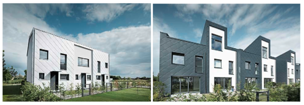 Sono stati scelti dei sistemi di facciata PREFA per gli edifici residenziali a schiera di questo quartiere di Berlino.