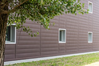 Le doghe, color testa di moro, hanno finitura rillata e contrastano con il bianco dei serramenti creando un gradevole effetto estetico. L’utilizzo delle doghe Alu-skin porta anche altri vantaggi: offrono un’ottima protezione della facciata e non sono soggetti ad ammaloramento, aspetti fondamentali per un’opera pubblica che non deve richiedere costose manutenzioni.