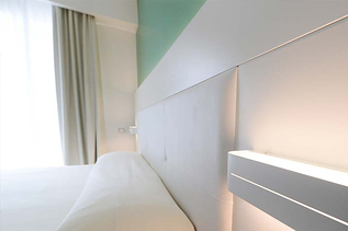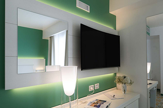 Grazie alle proprietà di Hydrowall Sanix, il design delle camere e dei bagni risulta più essenziale e sofisticato, senza rinunciare a scelte tonali di una certa personalità: giallo S1060-Y10R, verde S2030G e bianco sono i colori individuati per la nuova veste interna della struttura. Al di fuori delle camere, nei corridoi, è evidente l’utilizzo di M-K-SIL, colore: G60387, il nuovo rivestimento minerale a base di silicato di potassio ad effetto rasato fine (tipo marmorino), ad alta traspirabilità, applicabile a spatola e pennello.