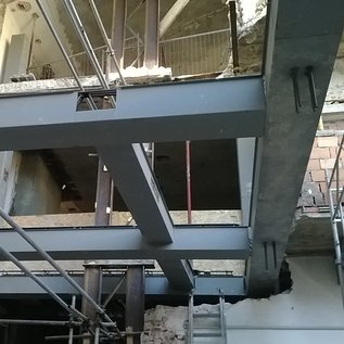 Dopo la realizzazione dei setti in calcestruzzo, sono state effettuate le demolizioni di aree minime di solaio di circa 1x1 m , così da consentire la posa dei pilastri dal basso. Si è proceduto quindi al montaggio dei pilastri in tronchi di 4 m con particolari giunzioni previsti alla metà di ogni piano.