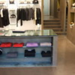 Le pareti, che si intonano al pavimento, sono interrotte da setti a specchio, mentre nel retro spicca il cerchio giallo dorato dove sono esposti i capi più preziosi, il tutto è poi arricchito dagli arredi in acciaio e vetro.