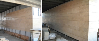 Isotec Parete è un sistema isolante continuo e portante, con anima isolante in poliuretano rigido ad alte prestazioni, rivestito su entrambe le facce da una lamina di alluminio e dotato di un correntino asolato in acciaio integrato nel pannello. Il correntino svolge una doppia funzione: assicura in primo luogo l’attivazione della ventilazione naturale fra il rivestimento e il pannello, mentre dal punto di vista statico costituisce il supporto ottimale e versatile per tutti i tipi di rivestimento per facciata, sia leggeri che pesanti.In questo caso, le lastre in travertino sono state ancorate al correntino di Isotec Parete mediante morsetti in acciaio.