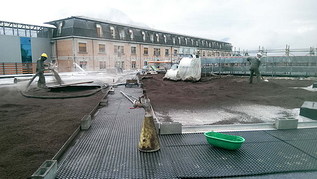 Dal punto di vista esecutivo si è optato per una stratigrafia funzionale che ha previsto nell'ordine la posa di una membrana impermeabile antiradice, sulla quale è stato quindi collocato un tessuto non tessuto di elevata grammatura (intorno ai 300 gr/m2) con funzione di protezione meccanica, un pannello drenante, un ulteriore strato filtrante di separazione in tessuto non tessuto di grammatura più leggera (intorno ai 100 gr/m2), su cui infine è stato posato il substrato colturale LecaGreen estensivo nello spessore di circa 8/10 cm dove sono state messe a dimora piante di Sedum. La posa di quest'ultimo è avvenuta mediante pompaggio da cisterna vuoi per l'assenza in cantiere di adeguate attrezzature di sollevamento, vuoi per la tempistica ristretta imposta dalla Direzione Lavori, vuoi infine per la massiccia presenza impiantistica in copertura, che ha reso questa modalità decisamente più rapida e funzionale.