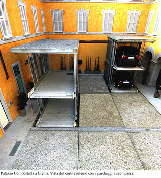 Palazzo Compostella è situato nel centro storico di Crema e si apre su una via privata, diramazione di Via Matteotti, nel percorso che anticamente si apriva verso l’Abbazia. Il Palazzo è stato restaurato a partire dal 2005 e contestualmente all’intervento è stato realizzato un parcheggio interrato nel cortile interno. In 150 mq sono stati ricavati 18 posti auto indipendenti, utilizzando la tecnologia Idealpark serie C. La soluzione adottata, completamente a scomparsa, permette di conservare libero l’ampio cortile rivestito in acciottolato, ottenendo un ottimo impatto ambientale. Non viene occupato spazio per le corsie di manovra, ottimizzando quindi il numero di posti auto, e non è necessario il locale di ricevimento (di solito 6 x 3 metri) come accade per i parcheggi automatizzati.