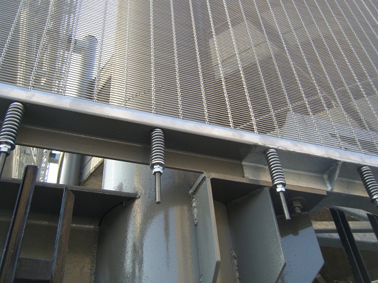 La tela metallica scelta è costituita da fili e funi metalliche in acciaio inossidabile ed è in grado di resistere a importanti azioni del vento anche per elevate altezze. E’ stato così possibile rivestire la facciata utilizzando pannelli di grandi dimensioni fino a 20-25 m di altezza. Anche per questi casi, il prodotto si può percepire visivamente in lontananza come un “velo sottile e leggero”.
