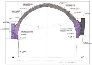 Oltre agli interventi appena esposti, il consolidamento del 2° arco prevede un ulteriore intervento in corrispondenza della zona di contrasto di sinistra. In particolare si è resa necessaria una parziale ricostruzione della zona di imposta mediante la tecnica del cuci-scuci con elementi di recupero e malta antiritiro, garantendo la perfetta ammorsatura dei nuovi elementi alla parete rocciosa esistente mediante l’inserimento di 3 barre Φ12 in perfori Φ20 posti ogni 20 cm, profondi 50 cm e iniettati con miscele antiritiro.