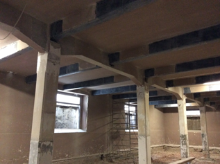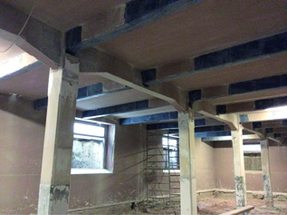 Si interviene mediante l’applicazione di lamine pultruse e tessuti in fibra di carbonio all’intradosso del solaio, secondo le modalità di posa fornite dal CNR DT 200/2004. In questo modo vengono riprese le nuove sollecitazioni di flessione e taglio, sorte in seguito anche alla demolizione dei pilastri preesistenti.