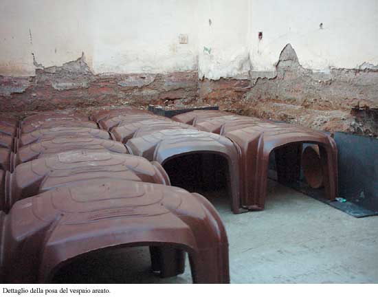 La problematica dell’umidità di risalita capillare è stata affrontata tramite una particolare tecnica di vespaio areato, che garantisce contemporaneamente prestazioni statiche, stabilità termigrometrica, resistenza agli urti, resistenza ai raggi UV e barriera al gas radon.