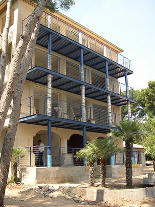 I ballatoi e il vano ascensore della Residenza Villa Le Phare a Roquebrune-Cap Martin in Francia sono stati realizzati con una struttura portante costituita da pilastri di sezione circolare, travi principali e arcarecci in profili IPE, solaio in lamiera grecata collaborante.