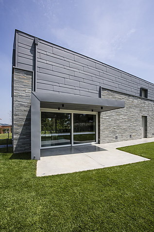 Forme lineari, essenziali, semplici così come le tonalità neutre del grigio scelte per i rivestimenti, contraddistinguono questa elegante residenza progettata dallo studio BAU Associati di Reggio Emilia. Il volume allungato e regolare del corpo di fabbrica ha richiesto in fase progettuale la ricerca di soluzioni tecniche ed estetiche originali, in grado di alleggerire e dinamicizzare l’effetto architettonico, integrandosi perfettamente con l’intorno. La scelta dell’alluminio PREFA per la copertura è stata adottata in virtù della sua eccellente resistenza abbinata ad una estrema leggerezza, sia in termini di peso che di impatto estetico. Con soli 0,7 mm di spessore, i nastri in alluminio PREFA proteggono e rivestono l’edificio come una seconda pelle. “Grazie alle sue peculiarità” affermano i progettisti dello studio BAU Associati “l’alluminio interpreta bene la forma delicata del tetto, senza appesantire l’architettura dell’edificio”.