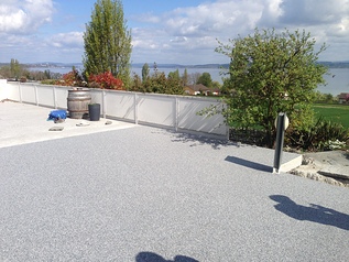 Grazie a queste competenze, Triflex è stata selezionata come partner per il progetto di riqualificazione della terrazza sul tetto di una villa privata a Landschlacht in Svizzera, frazione del comune svizzero di Münsterlingen - nel Canton Turgovia - che si affaccia sul Lago di Costanza. La copertura originale della terrazza, realizzata con fondo in calcestruzzo e pavimentazione in pietra, era stata compromessa dagli agenti atmosferici e, in prossimità dei punti di giuntura e delle crepe della superficie, i danni riportati avevano causato infiltrazioni nel garage e nel seminterrato adiacente. Dopo una valutazione delle condizioni in cui versava la superficie, la ditta appaltatrice dei lavori ha optato per la rimozione della copertura in pietra danneggiata e la realizzazione di una nuova copertura affidandosi ai sistemi Triflex, garanzia di ottime prestazioni e durabilità nel tempo.