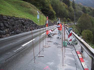 Il risanamento di una strada montana in Svizzera, realizzato nel 2004, ha riguardato un tratto in asfalto confinante sia a monte che a valle da una muratura a secco in massi. In seguito alle molteplici riasfaltature, lo strato bituminoso presentava una consistenza di ben 15 ÷ 20 cm mentre lo strato di ripartizione sottostante in ghiaia uno spessore di 60 cm, sotto i quali si trovava materiale di riporto granulare morenico.