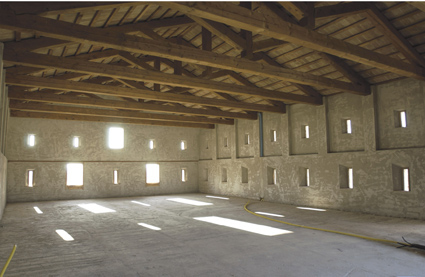 Nel suo complesso, il progetto di ristrutturazione ha avuto come obiettivo la conservazione e la valorizzazione delle le caratteristiche architettoniche originali dell’edificio, in particolare la struttura a capriate con mattoni a vista di questo antico essicatoio, ora studio fotografico. L’altezza dei soffitti – fino a 5 metri – e il muro perimetrale costituito dalle tradizionali “lamelle” (fori verticali per l’illuminazione e l’aerazione, caratteristica storica soggetta a vincolo architettonico), sono ampiamente visibili nella loro dimensione originaria grazie alla scelta di divisori in cartongesso per l’allestimento dello studio. Le pareti dei locali interni raggiungono infatti un’altezza non superiore ai 2,50 metri, e sono completate da una struttura di policarbonato alveolare fino al raggiungimento della capriata. Le stanze, ad eccezione di un soppalco, sono prive di soffittatura.